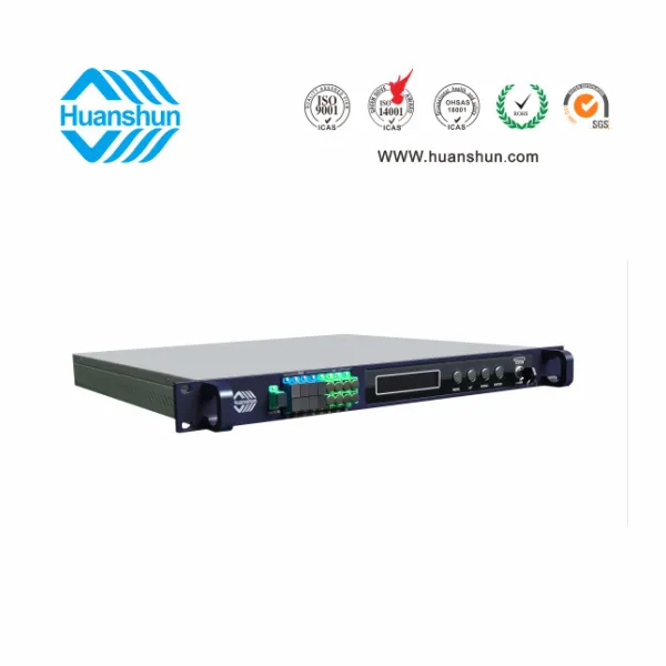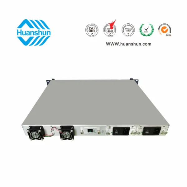 19 " 1U標準機箱,-5 ~ +10 d Bm輸入,8路標稱規格(16、17、18、19、20、21dBm)放大輸出,并支持下調-2dB,安全連接模式,NF ≤ 5dB(0dBm時);內置FWDM合波器,插播損耗 ≤ 1dB;雙模塊熱插撥電源,AC90 ~ 255V或DC-48V供電,RJ45標準網管(支持SNMP、WEB)
